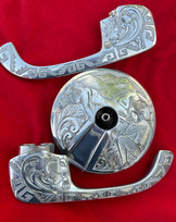 Engraving for Hilario is a meticulous process that begins with a thoughtful sketch to ensure "the design flows with the shape of the piece." He explained, "I make any necessary design adjustments and then cut away." He prefers aluminium for its softness and mild steel for its reflective quality, which enhances each finished piece.