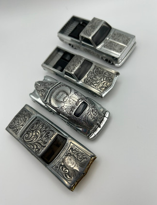 "My life changed the moment I saw those engraved lowrider wire wheels at a local swap meet," Hilario recounted. This discovery fused his childhood love for art and lowriders, igniting a passion that propelled him into the world of engraving. "I bought the cheapest tool I could find and started engraving on any piece of metal and glass that I could find," he told me, highlighting his self-driven path into the craft.